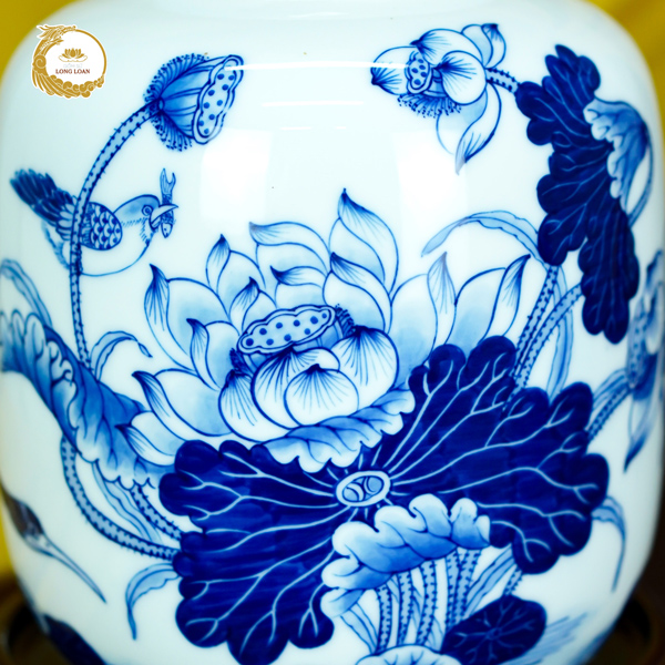 Điểm đặc biệt khiến bình gốm sứ Bát Tràng này trở nên độc đáo chính là họa tiết hoa sen kết hợp cùng đôi chim hạc, tất cả được thể hiện trên nền men trắng tinh khiết bằng kỹ thuật vẽ lam truyền thống. Mỗi đường nét vẽ tay uyển chuyển, tinh xảo, thể hiện sự tài hoa của nghệ nhân Bát Tràng. Biến chiếc bình thành một tác phẩm hội họa sống động trên chất liệu gốm sứ.