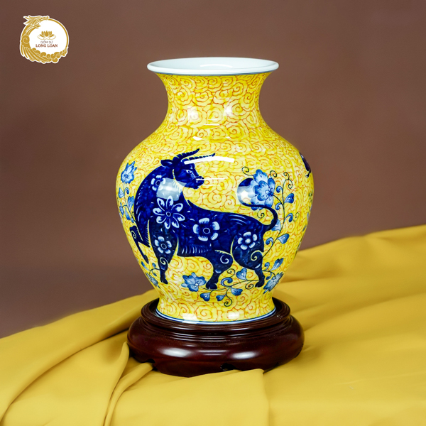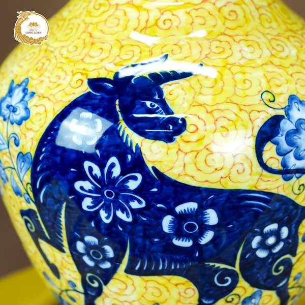 Điểm nhấn đặc biệt nhất của bình gốm sứ Bát Tràng chính là hình tượng con giáp (Tỵ – Dậu – Tuất) với màu xanh lam uốn lượn mềm mại trên nền vàng rực rỡ. Trên thân con giáp phủ những bông hoa trắng, như muốn nhấn mạnh sự hài hòa giữa sức mạnh và sự dịu dàng, giữa bản lĩnh và tinh hoa trí tuệ.