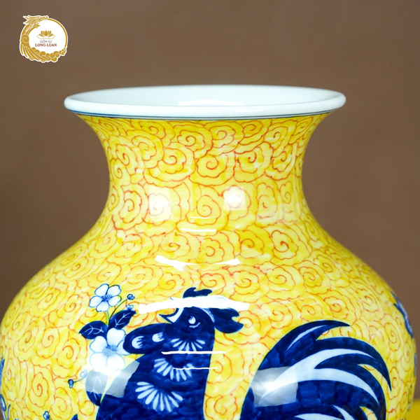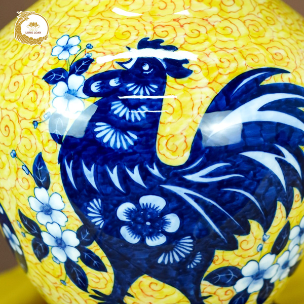 Hình ảnh chú gà trống oai vệ được vẽ bằng men lam xanh nổi bật trên nền vàng tươi sáng. Thân gà vững vàng, đôi cánh xòe mạnh mẽ, chiếc đuôi cong kiêu hãnh cùng ánh mắt sáng rực. Tất cả tái hiện hình tượng một linh vật đầy khí phách, tượng trưng cho ý chí, sự tỉnh thức và tinh thần bảo hộ.