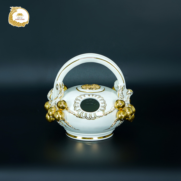 Màu vàng kim vốn được coi là màu của sự cao quý, trường tồn và thịnh vượng. Trong văn hóa tâm linh Á Đông, vàng còn tượng trưng cho ánh sáng của trí tuệ, sự hưng thịnh và tài lộc. Khi kết hợp với nền bạch ngọc thuần khiết, sản phẩm vừa toát lên sự sang trọng vừa gợi cảm giác thanh tịnh, tinh khôi. Những chi tiết quả cầu vàng gắn quanh thân bình được xem như biểu tượng của phúc – lộc – thọ. Mang ý nghĩa cầu mong cuộc sống sung túc, con cháu sum vầy, gia đình hạnh phúc lâu bền.
