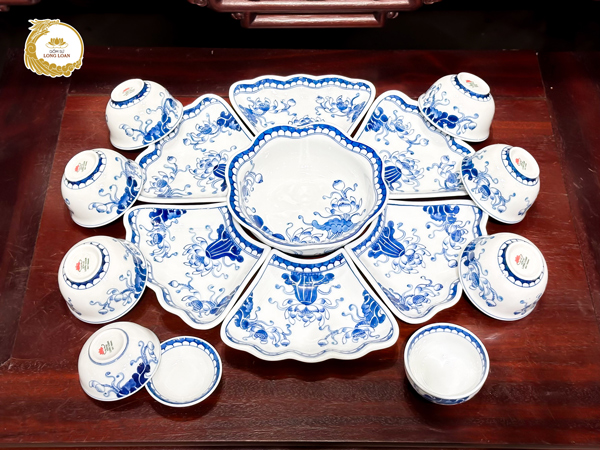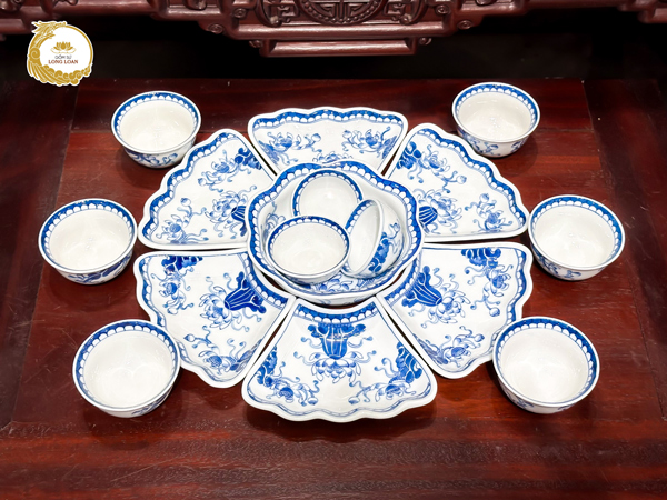 Bộ bát đĩa hoa mặt trời Hoa Sen men lam – Gốm sứ Bát Tràng