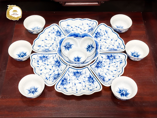 Sự kết hợp giữa dây hoa sen thanh khiết và chữ Thọ cát tường khiến tổng thể bộ bát đĩa trở thành biểu tượng của may mắn, tài lộc và bình an, vừa có giá trị thẩm mỹ cao, vừa mang chiều sâu tâm linh phong thủy. Hơn nữa, khi kết hợp cùng sắc men lam truyền thống tạo nên nét nhẹ nhàng, thanh thoát lan tỏa cảm giác yên bình và cao quý.