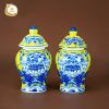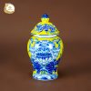 Nổi bật trên nền men vàng hoàng gia là họa tiết hoa sen với sắc xanh lam cổ điển, kết hợp hài hòa thành tổng thể sang trọng và ấm cúng.