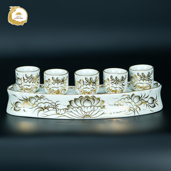 Kỷ ngai thờ 5 chén Sen bạch ngọc vẽ vàng kim – Gốm sứ Bát Tràng